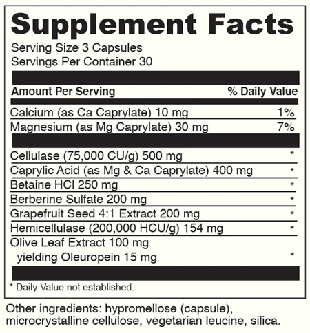 Candid-Away™ is specifically formulated to support detoxification of the digestive tract to maintain a healthy balance of intestinal microflora. It combines a unique mixture of Olive Leaf Extract to support immune system function, Calcium Caprylate and Grapefruit Seed Extract to maintain a healthy balance of intestinal microflora, Berberine to inhibit the growth of yeast, bacteria and protozoa, Betaine HCl for acid balance in the stomach and fiber digesting enzymes (cellulase and hemicellulase) to balance microflora.