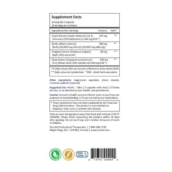 Microcidin® contains multiple antimicrobial ingredients that work through different mechanisms to promote microbial balance and detoxification. At its core is Coptis (Huang Lian), a revered herb in Traditional Chinese Medicine known for its detoxifying properties and high berberine content, effective especially during infections and conditions of Liver Fire. Coptis alone, or combined with clove extract, has demonstrated fungal-inhibiting properties. The formula also features lab-standardized, high-allicin garlic concentrate, providing potent immune support, along with highly concentrated oregano extract and caprylic acid to create a comprehensive, broad-spectrum microcidal effect.