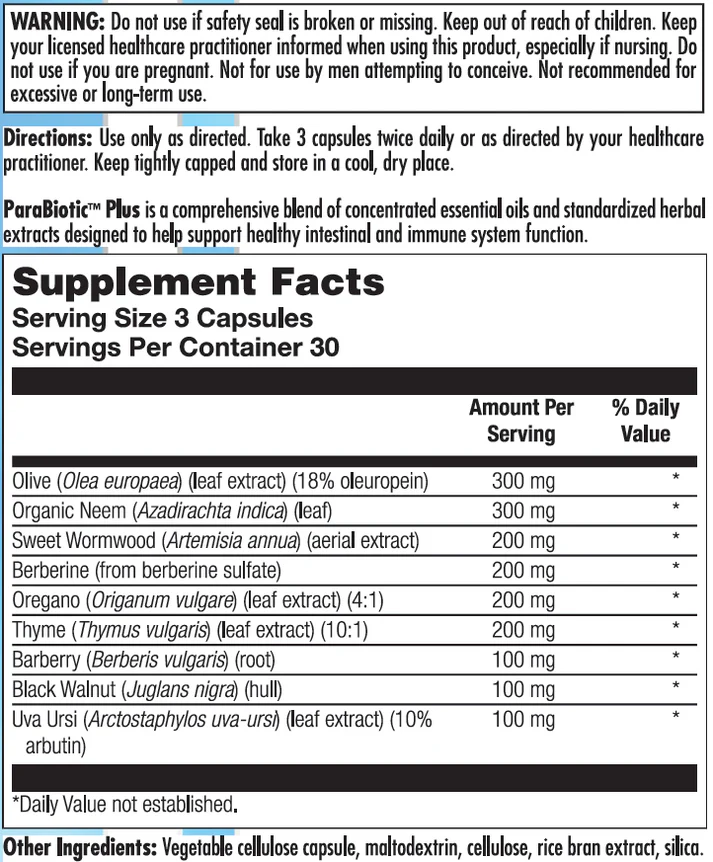 Para Biotic Plus combines traditional botanicals including wormwood, black walnut, thyme, olive leaf extract, and neem to help support a healthy intestinal microbiota and promote immune system resilience. This comprehensive formula is designed to maintain microbial balance and gastrointestinal wellness, making it an excellent choice for seasonal or targeted immune support.