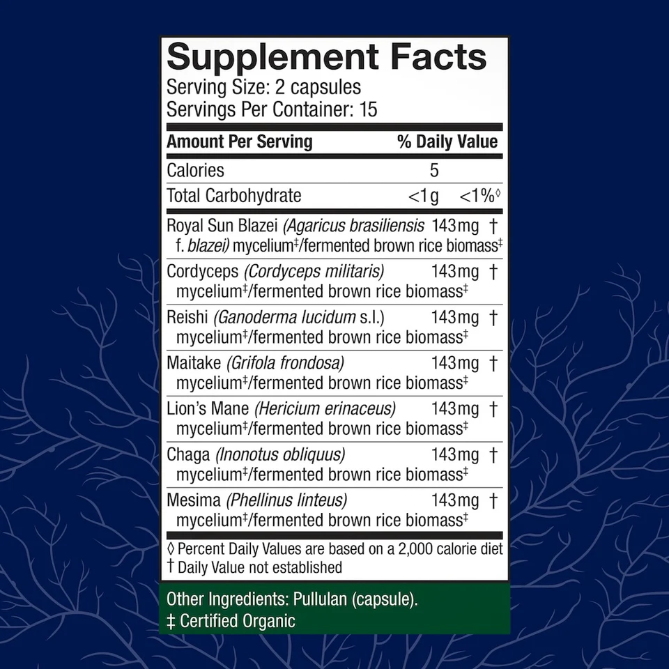 Stamets 7 Capsules provide comprehensive support for an engaged and balanced immune response, helping the body adapt to physical, mental, and environmental stress factors. It promotes the health of respiratory, digestive, circulatory, cellular, lymphatic, and systemic functions to support foundational immunity.
