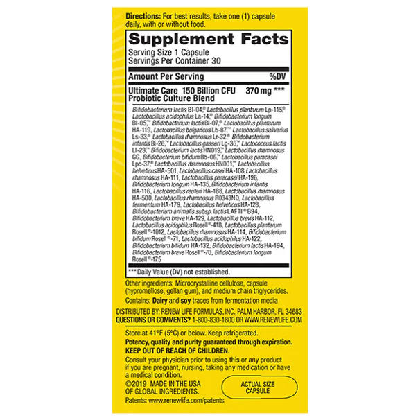 Renew Life® Ultimate Flora Extra Care Probiotic is a powerful, science-backed formula with 150 billion CFU from 40 diverse, clinically studied strains—more than the leading brand.† This high-potency probiotic is designed to help ease occasional digestive upset, promote digestive balance, and support colon, immune, and respiratory health. Each delayed-release capsule ensures that probiotics reach the gut alive for maximum effectiveness. Formulated by microbiologists and backed by 25 years of research, it includes the #1 most-studied strain† and comes with a 60-day satisfaction guarantee. Every strain is clearly listed, and every bottle promises potency, quality, and purity through expiration—so you can feel confident in your gut health journey.