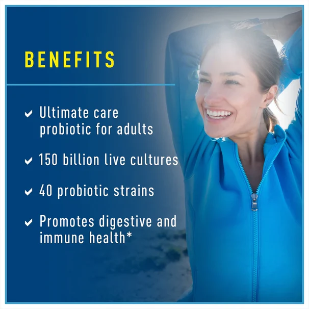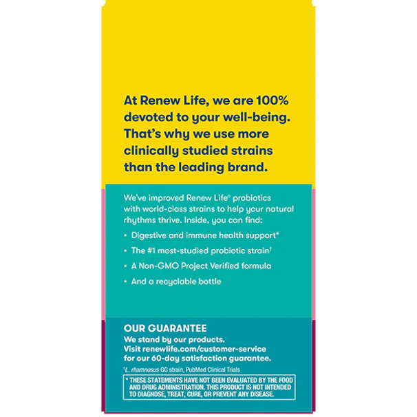 Need to step up to greater support? Renew Life® Ultimate Flora Extra Care Probiotic delivers 150 billion live cultures from 40 clinically tested strains to help ease occasional digestive upset, rebalance your gut, and promote immune and respiratory health—all in a once-daily, delayed-release capsule. Potency, quality, and purity are guaranteed through expiration.